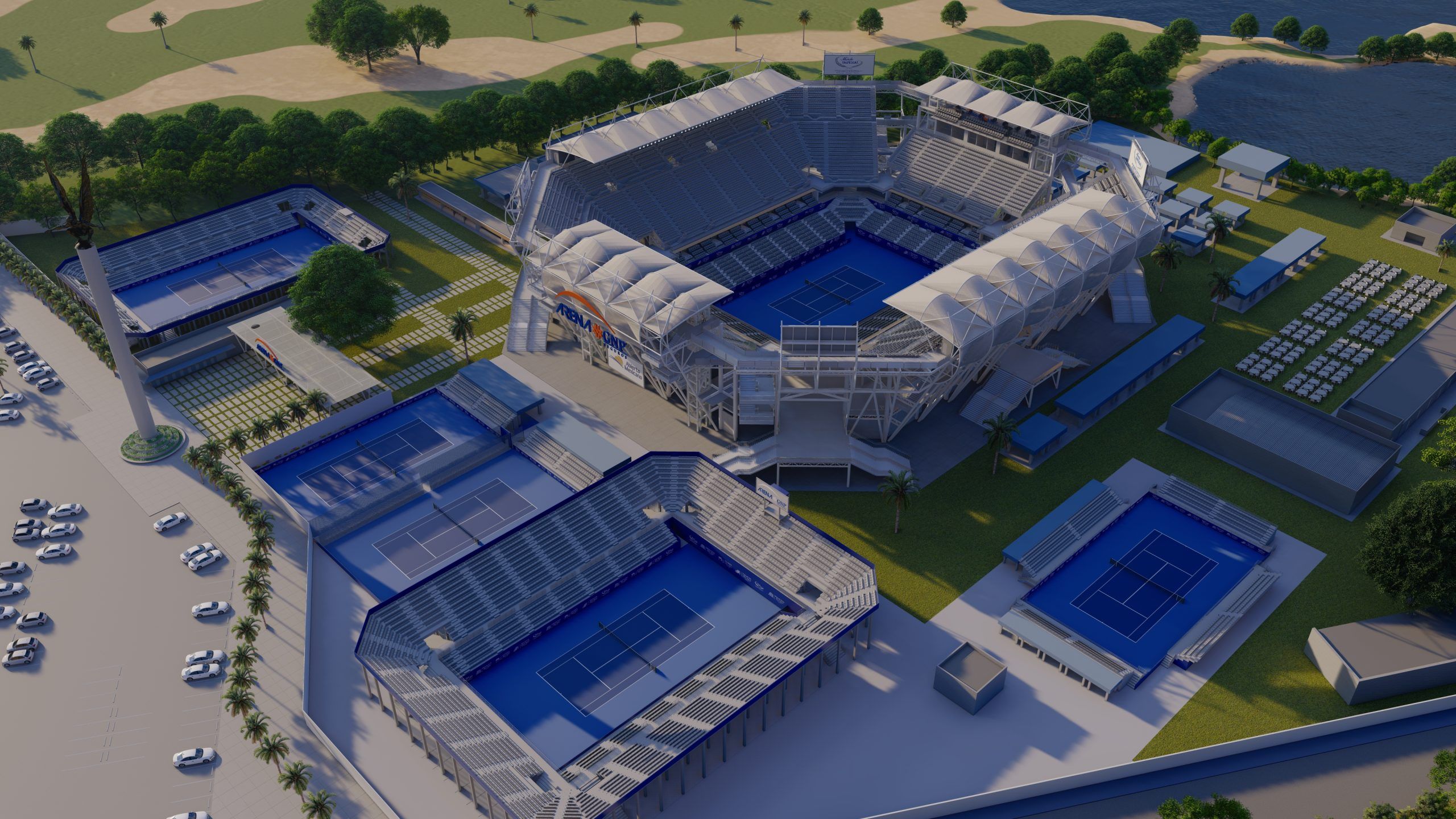 El Estadio Principal ofrece instalaciones de gran calidad bajo un diseño moderno y cómodo que permite inmejorables vistas desde cualquier asiento de las gradas. Está diseñado para sentar a más de 10,000 espectadores haciéndolo el Estadio más grande de ATP de todo Latinoamérica. Asimismo, el complejo incluye un Grand Stand (Grand Stand Caliente.mx) para más de 2,000 personas; 4 canchas alternas con espacio para más de 2,200 personas; espacios abiertos de comida y bebida; así como restaurantes, tiendas y un área extensa de entretenimiento para toda la familia.