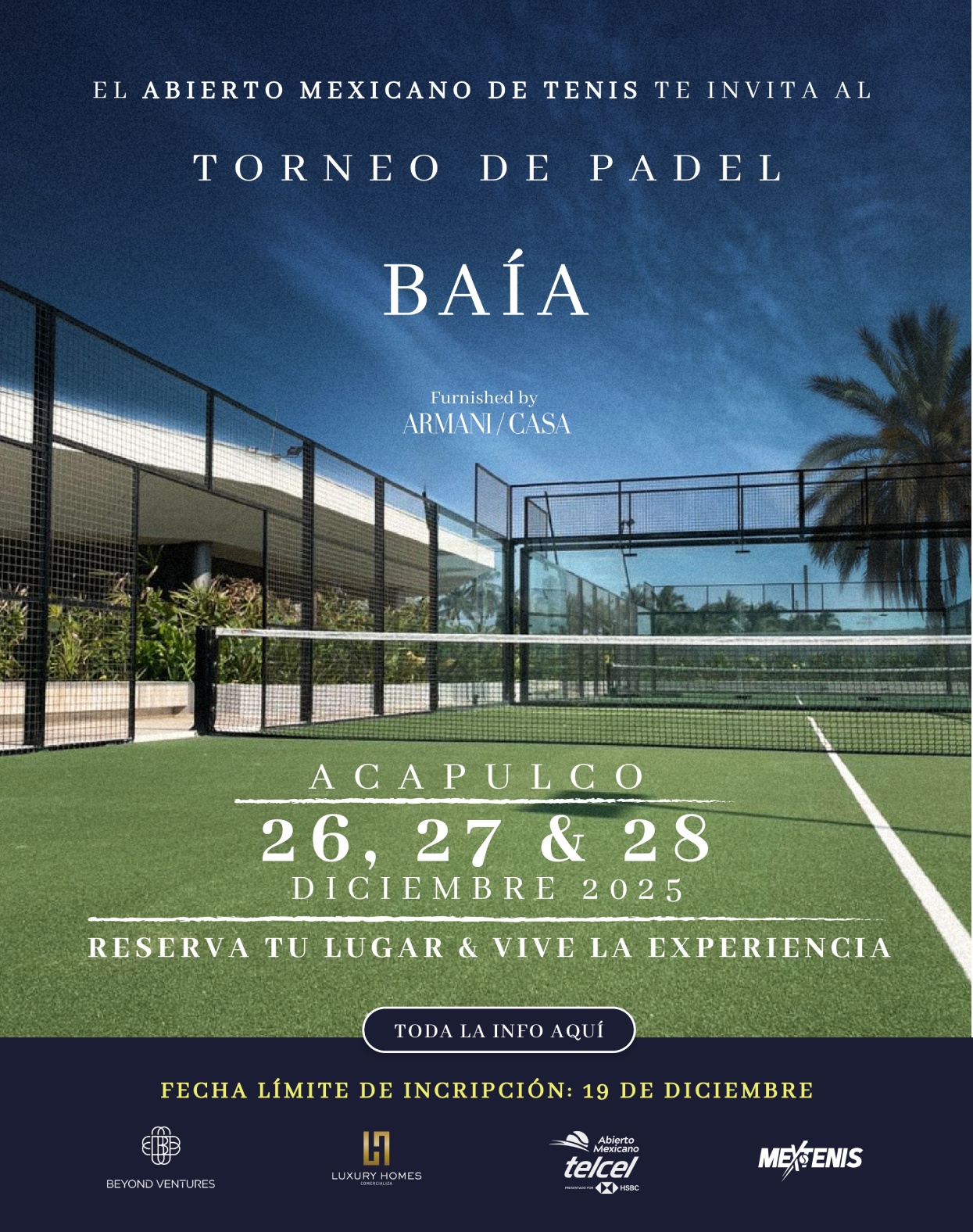 ¡El Abierto Mexicano de Tenis Telcel presentado por HSBC te invita a cerrar el año con un fin de semana lleno de pádel en Acapulco! Te invitamos a participar en nuestro Torneo de Pádel Baía en parejas categorías A y B, varonil y femenil, para jugadores que buscan competir, convivir y disfrutar del mejor ambiente frente al mar.
