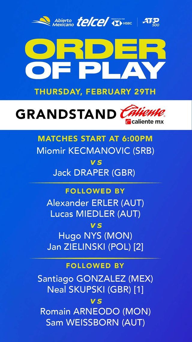 El campeón defensor Alex de Miñaur se medirá ante Stefanos Tsitsipas, mientras que Holger Rune hará lo propio contra el alemán Dominik Koepfer, quien derrotó al estadounidense Frances Tiafoe. En el Grandstand, Ben Shelton y Casper Ruud ganaron sus respectivos duelos de octavos de final y ahora se miden en el partido estelar de la tercera ronda. Mientras que el británico Jack Draper quiere demostrar que sus dos victorias no han sido casualidad y que es de los sólidos contendientes. Se enfrentará en el último encuentro de cuartos de final a Miomir Kecmanovic. Vale la pena resaltar que el actual monarca de Acapulco, Alex de Miñaur, se convirtió en el primer campeón vigente que avanza a cuartos de final después de 7 años, pero tendrá un duro reto ante el griego Tsitsipas ya que lo aventaja 10-0 en enfrentamientos directos.